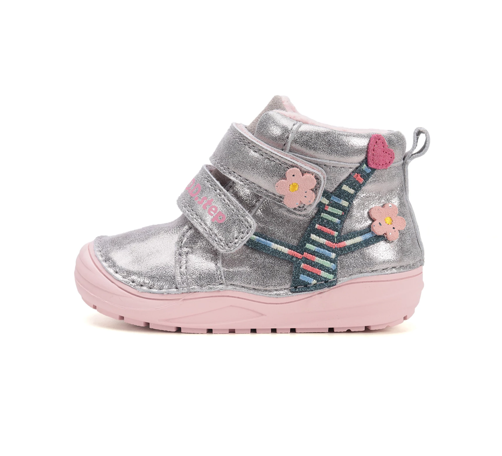 A D.D.Step ezüst színű, virágmintás kislány cipő tökéletes választás a mindennapokra. A magas minőségű bőr felsőrész és a puha, rugalmas talp kényelmet biztosít minden lépésnél, míg a két tépőzár segítségével könnyedén fel- és levehető. A zárt kialakítás védi a kis lábakat, a bájos virágos hímzés pedig játékos, vidám stílust kölcsönöz. Óvodába, sétákhoz és mindennapi viseletre is ideális választás.