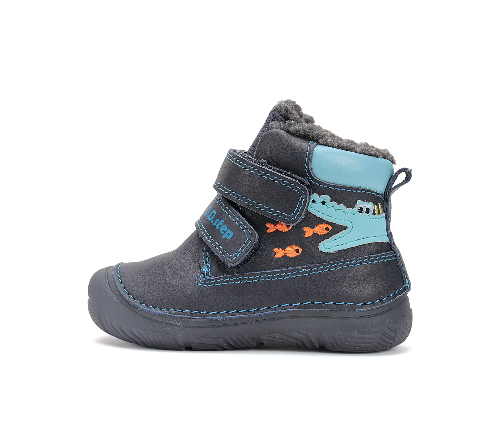 Ez a sötétkék kisfiú téli cipő nemcsak cuki halacskás / krokodilos mintájával hódít, hanem praktikus és kényelmes viseletet is nyújt a hideg hónapokra.